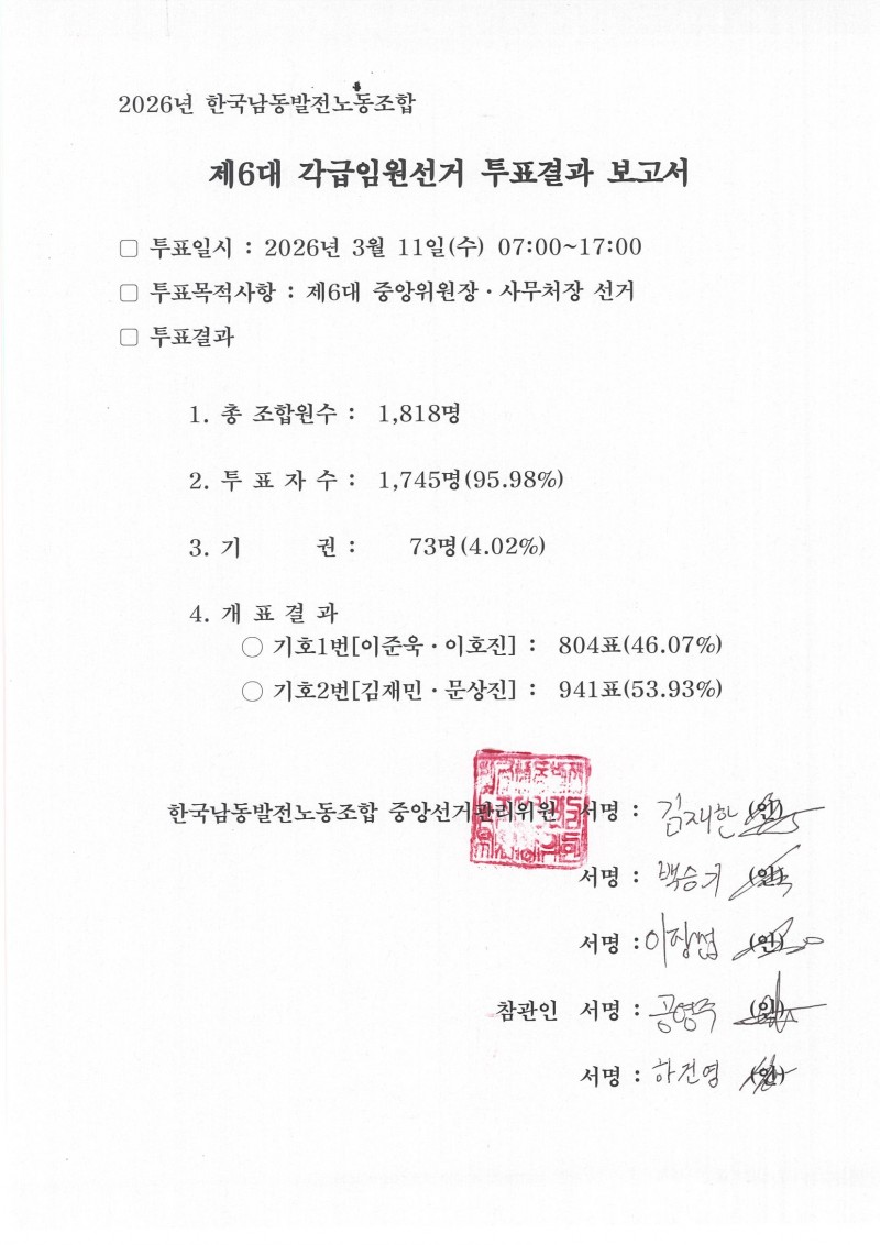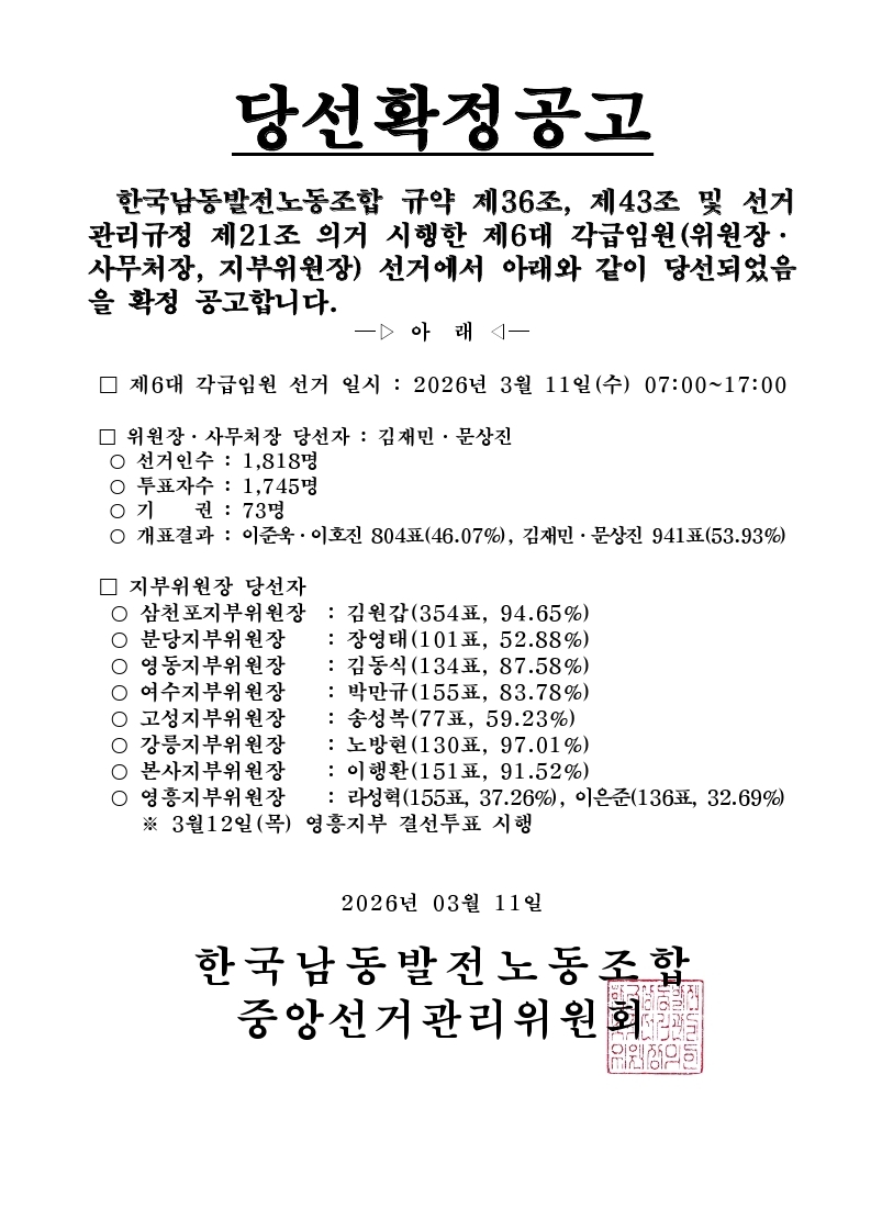 [공지] 제6대 각급 임원 선거 당선 확정 공고